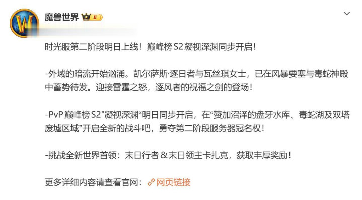 有人就会问了,既然魔兽世界时光服中的冠名活动的口碑特别差,那么雷火会不会停止呢?目前来看雷火并不会停止冠名活动,而今天官方账号已经发布了S2即将开启,并且S2的地点已经确定了各种各样的规则已经出来了,换句话说这个冠名活动还是持续进行的,玩家们的意见雷火几乎是无视了,或者说可能会有优化。